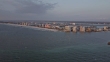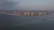 Ungraded D-Log aerial pan shot of Clearwater Beach, Clearwater Pass and Sand Key Beach in Clearwater, FL.