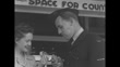 [Clip from Canadian propaganda film "Soldiers All," from the series "Canada Carries On" by the National Film Board of Canada; narration throughout by a man with an Australian accent, speaking of soldiers' experience in Canada] WS Skiers down snow hill/ Front view of skiers coming / CU skiers / CU front view of skiers skiing toward and over camera / WS mountains in summer seen between trees / MS men and women picnic, cooking over campfire, man swinging tea can / MS soldiers and women eating hot dogs at counter / CU woman and soldier eating hot dog / MS soldiers and women having a carriage ride / PAN soldiers and women waving from a convertible car / Front view of soldier, woman ride with an old man on horse cart / CU soldiers and woman in carriages / MS soldiers and women get off horse carriage / MS soldiers looking at city skyline against mountains from balcony / WS scenic view of rolling hills and mountains / WS wheat field, mountains in background / PAN snow capped peaks of Rocky Mountains / CU pilot gets into cockpit / MS planes taking off / PAN planes flying in formation in air / MS two planes in air / [VO closing narration by Lorne Greene] CU pilot / MS planes in air / CU planes in air / End card: "Recorded at Associated Screen Studio Montreal - The End - Distributed by Columbia Pictures of Canada" / Note: exact month/day not known