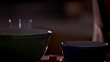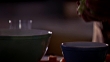 CLOSE ANGLE OF A KITCHEN TABLE TOP WITH PYREX PRIMARY COLOR MIXING BOWLS, CHOPPED CARROTS AND A DRINKING GLASS. A WOMAN'S HANDS DROP CHOPPED CELERY INTO ONE OF THE BOWLS. COOKING. FOOD. VEGETABLES.