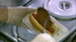 CLOSE ANGLE OF HOT DOGS ON FLAT FAST FOOD RESTAURANT GRILL. SEE WORKER WITH LATEX GLOVES PREPARE A CHILI DOG. HE PUTS HOT DOG IN BUN, THEN ADDS CHILI FROM METAL POT, MUSTARD, AND ONIONS
