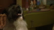 CLOSE ANGLE OF SHEPHERD MIXED MUTT OR AKITA MIX FACING POV PANTING. DOG LOOKS UPWARD AND DOWN. DOG HIDES BEHIND PAW AND CONTINUES PANTING