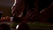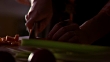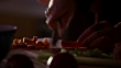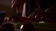 CLOSE ANGLE SHOWS A WOMAN'S HANDS CHOPPING A CARROT WITH A CHEF'S KNIFE AND A CHILD'S HANDS CHOPPING CELERY WITH A PARING KNIFE. SEE RED ONIONS, PYREX PRIMARY COLOR MIXING BOWL, AND CUTTING BOARD OR CHOPPING BLOCK ON TABLE. WOMAN WEARS SEVERAL RINGS, 70S STYLE CLOTHING. FOOD. COOKING. KITCHENS. VEGETABLES.