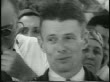 B/W 1938 close up Douglas "Wrong Way" Corrigan smiling + talking outdoors / crowd in background