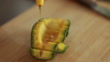 Close up hand mixing avocado fruit and honey