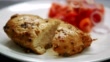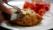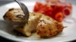 Close up knife cutting chicken steak on white plate - 4K stock video