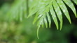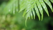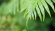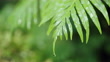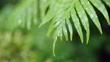 Close up lockdown shot at the wet Polypodium fern leaves shaking from the rain drop in the tropical rainforest on a sunny day. The water covering the shiny leaf surface causing reflection of the bright sunlight among the green abundant surrounding