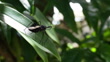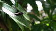 Macro video of a black insect (Assassin bug) Sycanus croceovittatus sitting on a green leaf with blurred foliage in the background. Great for themes of nature, environment, biodiversity, ecology, biology, and educational projects.