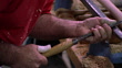 Close up man's hands using tool on lathe to shape baseball bat at Louisville Slugger Factory / Kentucky - HD stock video