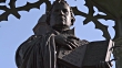 close up of Martin Luther monument at the marketplace in Wittenberg, Martin Luther holding the bible, bronze statue designed by Johann Gottfried Schadow,