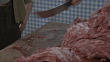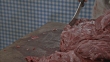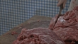 Close-up of a butcher slicing steaks off a slab of meat. - HD stock video