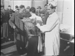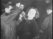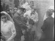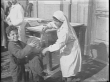 Close up of a sign on a post indicating typhus is carried by lice / Wide shots of Italian citizens of Naples grouped together in an underground cave shelter / Shots of blankets being deloused and spray guns used on the people and blankets to disinfect the lice as a baby lays in a bed / Shots of men spraying children and with the insecticide on the street as powder is pumped in a woman's sweater and on the face of an old man and in the hair of a young girl / Wide shot of soldier getting out of American vehicle and walking down the street / High angle pan shot of soldier walking down the rubble strewn street with people walking by / High angle shots of General Leon Fox and a doctor and nurse delousing people including a boy and small children / Medium shots of different children getting their clothes and hair sprayed with the delousing powder / Medium shots of Italian nurses spraying an elderly woman with delousing powder / Close up of nurse spraying powder in a woman's hair / Shots of nurses spraying powder all over an elderly mans clothing and all over his body / Wide shot of nurses delousing crowd.