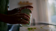 Close up shot of a woman in a kitchen. Sunlight is shining softly through the kitchen window. She is wearing a green and white shirt and has rings on her fingers. She is standing at the kitchen counter in front of a cutting board with pieces of green bell pepper on it. She is holding a glass jar in one hand full of green pepper pieces. She uses her other hand to grab two handfuls of the vegetable and put it in the jar. The camera sways as she grabs the lid and screws it on to keep her healthy ingredients fresh.