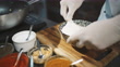 Close-up of an unrecognizable male chef adding sour cream as a final layer on risotto dish - 4K stock video