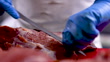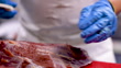 Close up of butcher removing the fat from a block of meat at a butchery - 4K stock video