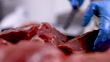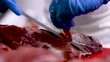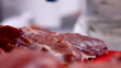 Close up of butcher removing the fat from a block of meat at a butchery - People at work concepts