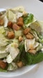 Close-up of Caesar salad with croutons on white plate. Fork taking a piece of lettuce from the plate.