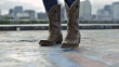 Close-up of cowboy boots dancing overlooking Austin, Texas city skyline