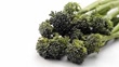 Fresh raw green broccolini aka bimi, close up on white background. Studio shot. High angle view. Rotating shot.