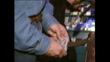Close up of pushing buttons on game controllers, people playing Nintendo Entertainment System in store; 1993 (BBC News Rushes, BC295 – 25/05/1993 – AEXZ288W).
