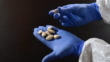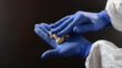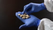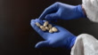 Close up of scientist hand in labor examining white beans. He is wearing protective globes. - 4K stock video