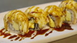 Extreme close-up of appetizing sushi roll with avocado and vegetable filling and wrapped with sliced raw white fish and drizzling with sweet soy sauce on a white serving plate on dining table at Izakaya restaurant.