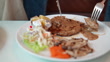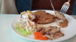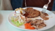 Close-up of woman hand using knife to slice hot steak on white plate on the table in the restaurant.