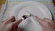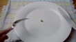Close up single green pea on plate being cut with a knife and fork - HD stock video