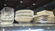 Close-Up Stacked Plates And Bowls On Japanese Restaurant Counter - 4K stock video