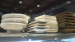 Close-up of ceramic plates and bowls stacked on a counter inside a Japanese restaurant. Authentic dining atmosphere, restaurant lifestyle, and Asian food culture.