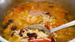 A close-up video of a spoon scoops a portion of rice from a pot of beans, vegetables and a golden broth. - 4K stock video