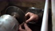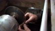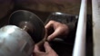 Close up view of hands of a jeweler holding a triskele shaped piece of metal near his cutting machine. - 4K stock video