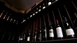 close up wide shot bottles standing on rack of wine cellar - focus pull - close up row of red wine bottles / pan red wine cellar