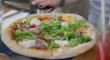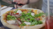Multi generation family enjoying eating a meal together in a restaurant. Closeup of a fresh pizza with cured ham, arugula and ricotta and creamy ravioli.Shot with Canon R5