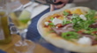 Closeup of a fresh pizza with cured ham and ravioli in cream sauce. - 4K stock video