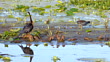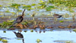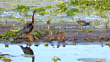 Large fishing bird and Common Gallinule on a sandbar in a wetland with water and lily pads