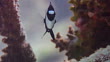 closeup of small humbug dascyllus – a damselfish – swimming among branches of a coral.