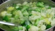 Closeup of steam coming from boiling soup with broccoli and cauliflower.