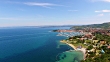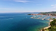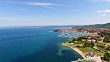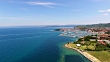 Aerial shot of an old coastal city Izola with a marina. Slovenia, Adriatic sea, Europe.