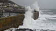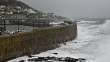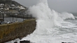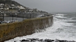 Severe coastal storm lashes fishing village with huge waves and sea spray over the sea wall.