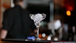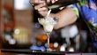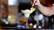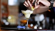 Bartender filling martini glass from cocktail shaker, making pina colada