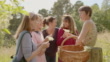 Medium shot of senior women foraging together in Northumberland in a non urban area talking and enjoying the summer. They are collecting edible plants/cow parsnip for their dinner in a basket and are standing talking together.
