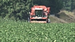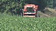 Combine harvester gathering in young soybeans Medium Long ShotHarvesting edamame (young, still green soybeans in the pod) / Nakasatsunai / Hokkaido