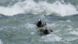 Compilation of harlequin ducks jumping into the river and floating - 4K stock video