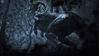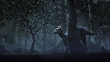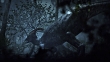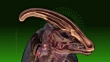 A computer animation illustrates the skull of a Parasaurolophus dinosaur in a rainy forest.