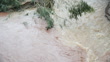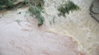 Confluence of muddy floodwaters in two distinct colors with bamboo debris, illustrating environmental chaos, flash flood aftermath, and the destructive force of nature in extreme weather