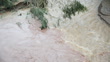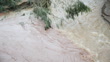 Confluence of muddy floodwaters in two distinct colors with bamboo debris, illustrating environmental chaos, flash flood aftermath, and the destructive force of nature in extreme weather - 4K stock video