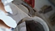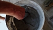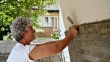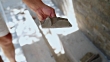 Construction worker is putting stucco on a piece of stone and gluing it on the wall.