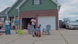A small group of adults chats warmly in a suburban driveway with a dog at their feet and kids playing nearby, enjoying an impromptu neighborhood gathering.