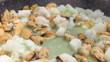 Close-up detail shot frying cuttlefish and mussels for a Valencian fideua