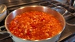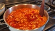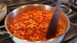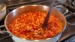 The navy bean, haricot bean, pearl haricot bean, Boston bean, white pea bean, or pea bean. Cooking navy beans with tomato and pepper paste, tomatoes, red peppers, onions, garlic, and olive oil. Plant based food.